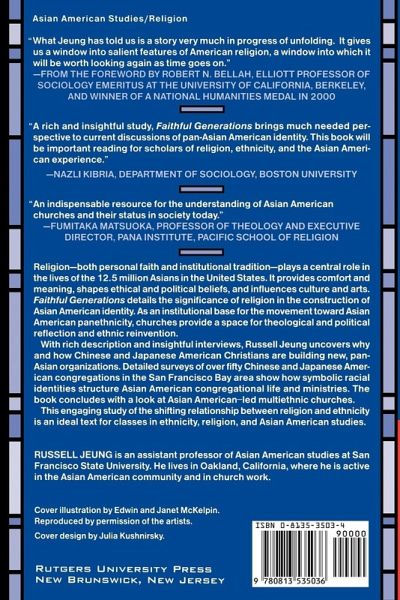 Religion-both personal faith and institutional tradition-plays a central role in the lives of the 12.5 million Asians in the United States. It provides comfort and meaning, shapes ethical and political beliefs, and influences culture and arts. Faithful Generations details the significance of religion in the construction of Asian American identity. As an institutional base for the movement toward Asian American panethnicity, churches provide a space for theological and political reflection and ethnic reinvention. With rich description and insightful interviews, Russell Jeung uncovers why and how Chinese and Japanese American Christians are building new, pan-Asian organizations. Detailed surveys of over fifty Chinese and Japanese American congregations in the San Francisco Bay area show how symbolic racial identities structure Asian American congregations. Evangelical ministers differ from mainline Christian ministers in their construction of Asian American identity. Mobilizing around these distinct identities, evangelicals and mainline Christians have developed unique pan-Asian styles of worship, ministries, and church activities. Portraits of two churches further illustrate how symbolic racial identities affect congregational life and ministries. The book concludes with a look at Asian American–led multiethnic churches. This engaging study of the shifting relationship between religion and ethnicity is an ideal text for classes in ethnicity, religion, and Asian American studies.