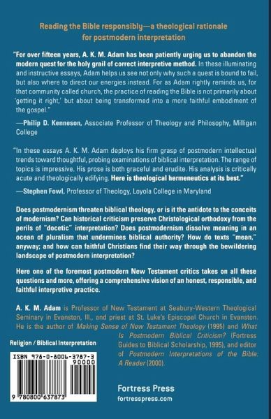 A K. M. Adam has become one of the leading voices inpostmodern criticism. This volume brings togetherhis original essays introducing postmodern interpretationand arguing its urgent importance for the life of thecontemporary church. Includes a bibliography and nameand Scripture indexes.