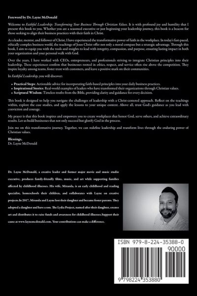 oreword by Dr. Layne McDonald Welcome to Faithful Leadership: Transforming Your Business Through Christian Values. It is with profound joy and humility that I present this book to you. Whether you are a seasoned executive or just beginning your leadership journey, this book is a beacon for those seeking to align their business practices with their faith in Christ. As a leader, mentor, and follower of Christ, I have experienced the transformative power of faith in the workplace. In today's fast-paced, ethically complex business world, the teachings of Jesus Christ offer not only a moral compass but a strategic advantage. Through this book, I aim to equip you with the tools and insights to lead with integrity, compassion, and purpose, ensuring lasting impact in both your organization and your personal walk with God. Over the years, I have worked with CEOs, entrepreneurs, and professionals striving to integrate Christian principles into their leadership. These experiences confirm that businesses rooted in ethics, respect, and service often rise above the competition. They inspire loyalty among teams, foster trust with customers, and leave a positive mark on their communities. In Faithful Leadership, you will discover:Practical Steps: Actionable advice for incorporating faith-based principles into your daily business practices. Inspirational Stories: Real-world examples of leaders who have transformed their organizations through Christian values. Scriptural Wisdom: Timeless truths from the Bible, providing clarity and guidance for every decision. This book is designed to help you navigate the challenges of leadership with a Christ-centered approach. Reflect on the teachings within, explore the case studies, and apply the lessons to your unique context. Above all, trust God's guidance as you lead with conviction and courage. My prayer is that this book inspires and empowers you to create workplaces that honor God, serve others, and achieve extraordinary results. Let us build businesses that not only succeed but glorify God in the process. Join me on this transformative journey. Together, we can redefine leadership and transform lives through the enduring power of Christian values. Blessings, Dr. Layne McDonald
