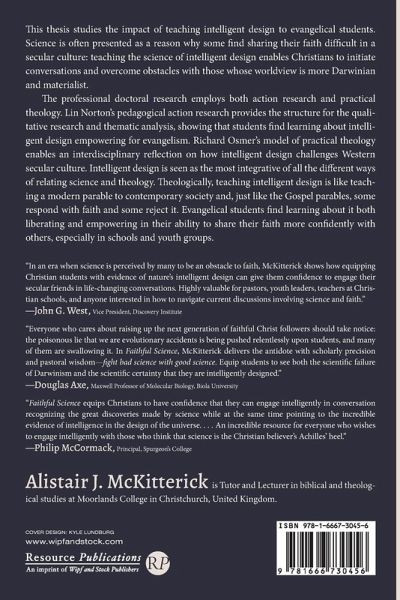 This thesis studies the impact of teaching intelligent design to evangelical students. Science is often presented as a reason why some find sharing their faith difficult in a secular culture: teaching the science of intelligent design enables Christians to initiate conversations and overcome obstacles with those whose worldview is more Darwinian and materialist. The professional doctoral research employs both action research and practical theology. Lin Norton's pedagogical action research provides the structure for the qualitative research and thematic analysis, showing that students find learning about intelligent design empowering for evangelism. Richard Osmer's model of practical theology enables an interdisciplinary reflection on how intelligent design challenges Western secular culture. Intelligent design is seen as the most integrative of all the different ways of relating science and theology. Theologically, teaching intelligent design is like teaching a modern parable to contemporary society and, just like the Gospel parables, some respond with faith and some reject it. Evangelical students find learning about it both liberating and empowering in their ability to share their faith more confidently with others, especially in schools and youth groups.