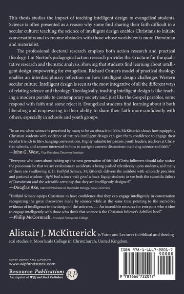 This thesis studies the impact of teaching intelligent design to evangelical students. Science is often presented as a reason why some find sharing their faith difficult in a secular culture: teaching the science of intelligent design enables Christians to initiate conversations and overcome obstacles with those whose worldview is more Darwinian and materialist. The professional doctoral research employs both action research and practical theology. Lin Norton's pedagogical action research provides the structure for the qualitative research and thematic analysis, showing that students find learning about intelligent design empowering for evangelism. Richard Osmer's model of practical theology enables an interdisciplinary reflection on how intelligent design challenges Western secular culture. Intelligent design is seen as the most integrative of all the different ways of relating science and theology. Theologically, teaching intelligent design is like teaching a modern parable to contemporary society and, just like the Gospel parables, some respond with faith and some reject it. Evangelical students find learning about it both liberating and empowering in their ability to share their faith more confidently with others, especially in schools and youth groups.