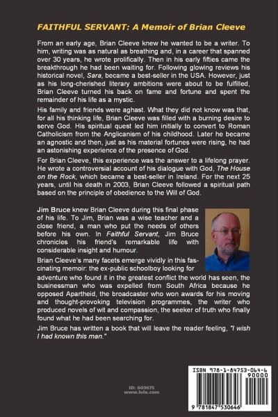 International spy, anti-apartheid activist, award-winning TV reporter, best-selling author. These are just some of the highlights of Brian Cleeve's eventful life. Yet for many years he felt unfulfilled. He wanted to be good, to make a difference. Above all, Brian Cleeve wanted to serve a God he wasn't sure even existed. So he searched for the answer to a simple question. Why am I here? Then, on the edge of despair, he had an extraordinary experience which convinced him that God is real. His life changed from that moment on. He walked away from his career as a successful novelist to spend the rest of his life in obedience to God's will. He wrote down everything he learnt as a legacy for anyone who wishes to follow. But he left an even greater legacy - the example of his own remarkable life. In Faithful Servant: A Memoir of Brian Cleeve, Jim Bruce has produced a fascinating book that will inspire all who read it.