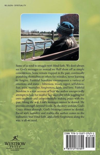 Some of us tend to struggle with blind faith. We don't always see God's messages or instead we fluff them off as simple coincidences. Some remain trapped in the past, continually punishing themselves or others for mistakes, never learning to forgive. Faithful Sunshine encompasses a variety of emotions and states - bitterness, worry, regret, selfishness, fear, pain, mortality, forgiveness, faith, and love. Faithful Sunshine is a true account of how the author unexpectedly attempts to help her mother face mortality while juggling her own emotions and unintentionally making peace with the past. Along the way, God's messages cannot be denied. He provides strength beyond words. As the story unfolds, God's Grace shines through. God's blessings cannot be denied. Faced with humility and reality, the author comes to the realization that blind faith, and a little forgiveness along the way, is all we need.