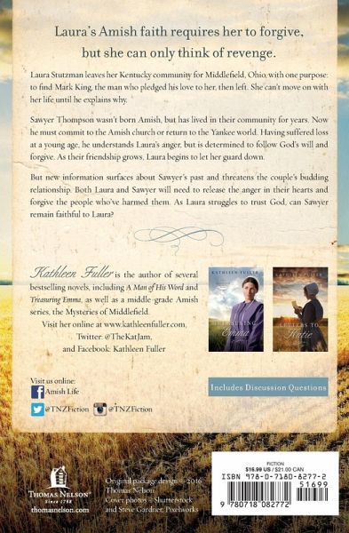 Laura's Amish faith requires her to forgive, but she can only think of revenge. Laura Stutzman leaves her Kentucky community for Middlefield, Ohio, with one purpose: to find Mark King, the man who pledged his love to her, then left. She can't move on with her life until he explains why. Sawyer Thompson wasn't born Amish, but has lived in their community for years. Now he must commit to the Amish church or return to the Yankee world. Having suffered loss at a young age, he understands Laura's anger, but is determined to follow God's will and forgive. As their friendship grows, Laura begins to let her guard down. But new information surfaces about Sawyer's past and threatens the couple's budding relationship. Both Laura and Sawyer will need to release the anger in their hearts and forgive the people who've harmed them. As Laura struggles to trust God, can Sawyer remain faithful to Laura?