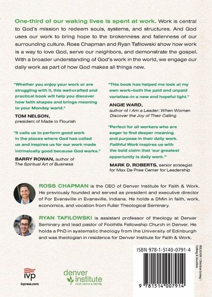 One-third of our waking lives is spent at work. Work is where we make culture and come into contact with our world. Work is central to God's mission to redeem souls, systems, and structures. And God works through our work to bring hope to the brokenness and fallenness of our surrounding culture. The gospel of Jesus Christ is good news for the world, and that includes the transformation of our ordinary work into a sacred calling. Ross Chapman and Ryan Tafilowski show how work is a way to love God, serve our neighbors, and demonstrate the gospel. With a broader understanding of God's work in the world, we are able to engage our daily work as part of how God makes all things new. This guide invites you to reflect on the meaning and purpose of your life's work and to transform your work into service to those around you.