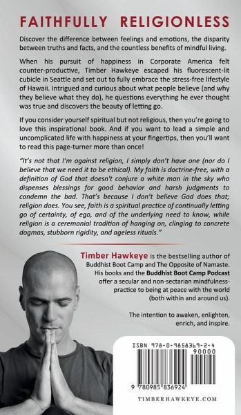 Discover the difference between feelings and emotions, the disparity between truths and facts, and the countless benefits of mindful living. When his pursuit of happiness in Corporate America feels counterproductive, Timber Hawkeye escapes the fluorescent-lit corporate cubicle in Seattle and sets out to fully embrace the stress-free lifestyle of Hawaii. Intrigued and curious about what people believe (and why they believe what they do), he questions everything he ever thought was true and discovers the beauty of letting go. If you consider yourself spiritual but not religious, then you're going to love this inspirational book. And if you want to lead a simple and uncomplicated life with happiness at your fingertips, then you'll want to read this page-turner more than once! "It's not that I'm against religion, I simply don't have one (nor do I believe that we need it to be ethical). My faith is doctrine-free, with a definition of God that doesn't conjure a white man in the sky who dispenses blessings for good behavior and harsh judgments to condemn the bad. That's because I don't believe God does that; religion does. You see, faith is a spiritual practice of continually letting go of certainty, of ego, and of the underlying need to know, while religion is a ceremonial tradition of hanging on, clinging to concrete dogmas, stubborn rigidity, and ageless rituals."