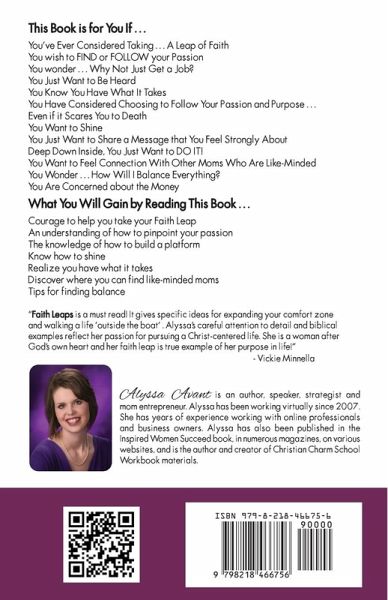 "FaithLeaps: The Christian Mom's Guide to Passion, Purpose, and Profits" is a transformative book designed specifically for Christian mothers who are ready to embark on a journey of faith and fulfillment. It speaks directly to those who sense a deeper calling beyond traditional roles, urging them to explore their passions and pursue their purpose with courage and conviction. For Christian moms wrestling with the desire to make a meaningful impact, "FaithLeaps" serves as a beacon of encouragement and practical wisdom. It challenges the notion of settling for the ordinary and instead encourages readers to embrace their unique gifts and aspirations. Whether you're contemplating a career change, seeking to amplify your voice, or simply yearning to align your life with your faith, this guide offers actionable insights and heartfelt support. The book resonates with the belief that every woman is destined for greatness and has the potential to shine brightly in her chosen endeavors. Through inspiring anecdotes, thoughtful reflections, and practical exercises, "FaithLeaps" empowers readers to discover their true calling, step boldly into their God-given purpose, and navigate the complexities of balancing faith, family, and career aspirations.