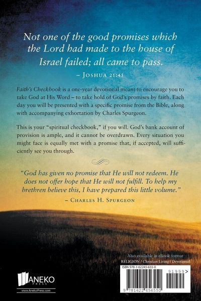 Not one of the good promises which the Lord had made to the house of Israel failed; all came to pass. - Joshua 21:45 Faith's Checkbook is a one-year devotional meant to encourage you to take God at His Word - to take hold of God's promises by faith. Each day you will be presented with a specific promise from the Bible, along with accompanying exhortation by Charles Spurgeon. This is your "spiritual checkbook," if you will. God's bank account of provision is ample, and it cannot be overdrawn. Every situation you might face is equally met with a promise that, if accepted, will sufficiently see you through. "God has given no promise that He will not redeem. He does not offer hope that He will not fulfill. To help my brethren believe this, I have prepared this little volume." - Charles H. Spurgeon