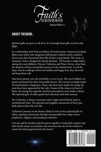 Spiritual gifts are given to all of us. It is through these gifts our lives take flight. In a relationship with Princess Juliana of Liechtenstein, American Jonathan Baker never knew how dangerous fatherhood would be until a political threat arose that threatened their life of their young family. The event, so traumatic, that it changed the family dynamic. He became a single father, raising his royal children, Princess Catherine and Prince Trevor, away from the shadows of their monarchal ancestry in the United States. It was his hope, that he could give them the healthy and happy lives they deserved and keep them safe. Years have passed, now the inevitable is set to occur. The royal children are grown and poised for their irrevocable futures. The current sovereign leader of Liechtenstein is dangerous. Those who have been under her charge for years have been oppressed by her rule. Unsure of the choices in front of them, the young heir apparent and heir presumptive must make a choice. The spiritual gifts of others guide their decisions and their journey. For Catherine, a chance encounter with a high school friend, leads to motherhood's door. The spiritual and tangible connections of their past finds advent from this new life. Catherine's journey to the throne, finds its roots in the spiritual gifts of others, gaining momentum through unsurpassable love, deep secrets, prophecies, religion, and shocking revelations. Can she and her brother pull the pieces together to help their country and their family return to normalcy and overcome the sins of the mother to ensure forward progression for the future?