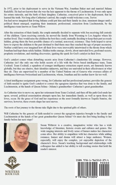 In 1972, prior to his deployment to serve in the Vietnam War, Jonathan Baker met and married Juliana Radcliffe. He had not known that she was the heir apparent to the throne of Liechtenstein. It was only upon his return stateside, and the birth of their daughter, Catherine, conceived prior to his deployment, that he learned the truth. Not long after Catherine's arrival, the couple would welcome a son, Trevor. Jon had never imagined that loving Juliana could put him and their family in clear, imminent danger until a political threat emerged, requiring their imminent, professional, extraction from Liechtenstein, by the intelligence team known as Team Willow. After the extraction of their family, the couple mutually decided to separate with Jon receiving full custody of the children. Upon receiving custody, he moved the family from Wyoming to Los Angeles where his mother lived. They would raise the children the best they could, mutually deciding to keep their past as royals hidden, giving them the best possible chance of a normal, non-royal, existence. They both hoped to never have to expose the children to the past destined to find them once they reached the age of proper ascension. Neither could have ever imagined how all their lives were irrevocably intertwined with the throne from which Jonathan had kept them safely hidden. Hidden truths emerge, slowly, about unrivaled love, profound secrets, prophetic revelations, and startling discoveries, igniting the spark for God's catalyst in their lives. God's catalyst comes when disturbing secrets arise from Catherine's clandestine life emerge. However, Catherine isn't the only one who holds secrets of a life with the Swiss-based intelligence team, Team Cocktail. Team Cocktail, a squadron of younger intelligence extraction expert assets, are famously known globally, but they are elusive, their identities unknown, and they are unrivaled in their effectiveness at what they do. They are supervised by a member of the United Nations out of Geneva who oversees affairs of intelligence between Switzerland and Liechtenstein, whom, Jonathan and his mother know far too well. A fated intelligence assignment gone wrong, for Catherine and her professional partner, provides the the genesis of faith needed to ignite God's catalyst to correct the egregious injustice that was done to the family, and Liechtenstein, at the hands of Queen Selma - Juliana's grandmother- Catherine's great grandmother. As Catherine tries to move on, upon her retirement from Team Cocktail, and then off the path God sends her upon; several, political assassination attempts upon her, her immediate family, as well as upon those she loves, occur. By the grace of God and her experience as the asset formally known as Tequila Sunrise survives; however, these events shape her next moves. The roots of her journey to the throne take flight due to the spiritual gifts of others. Will Catherine be the genesis of faith needed to correct the egregious injustice brought to the family and Liechtenstein at the hands of her great-grandmother Queen Selma? Or must she first bring healing to her family before her next steps?