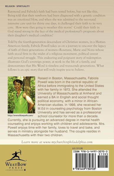 Raymond and Fabiola's faith had been tested before, but not like this. Being told that their newborn had been diagnosed with a genetic condition was an emotional blow, and when she was admitted to the neo-natal intensive care unit for thirty one days, it challenged their faith to its very core. How were they going to weather this storm? Could their faith in God stand strong in the face of the medical professional's prognosis about their daughter's medical condition? Told by the fourth-generation descendant of Christian women, in a Haitian American family, Fabiola Powell takes us on a journey to uncover the legacy of faith of three generations of women-Rosetane, Marie and Nora-whose faith stood firm in the midst of a religious movement, political unrest and personal struggle. This endearing and poignant story of redemption illustrates God's sovereign power, at work in the life of a family, and demonstrates that His Word is timeless and transcends generations. What follows is an epic story that will truly inspire you to believe. Learn more at www.mychurchinphiladelphia.com