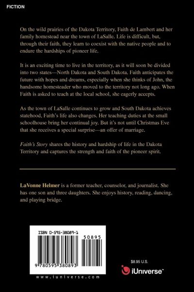 On the wild prairies of the Dakota Territory, Faith de Lambert and her family homestead near the town of LaSalle. Life is difficult, but, through their faith, they learn to coexist with the native people and to endure the hardships of pioneer life. It is an exciting time to live in the territory, as it will soon be divided into two states-North Dakota and South Dakota. Faith anticipates the future with hopes and dreams, especially when she thinks of John, the handsome homesteader who moved to the territory not long ago. When Faith is asked to teach at the local school, she eagerly accepts. As the town of LaSalle continues to grow and South Dakota achieves statehood, Faith's life also changes. Her teaching duties at the small schoolhouse bring her continual joy. But it's not until Christmas Eve that she receives a special surprise-an offer of marriage. Faith's Story shares the history and hardship of life in the Dakota Territory and captures the strength and faith of the pioneer spirit.