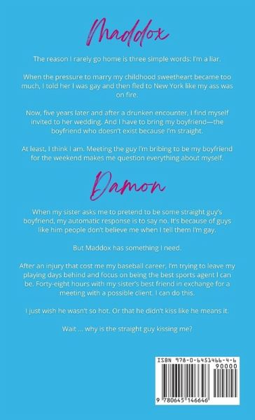 Maddox The reason I rarely go home is three simple words: I'm a liar. When the pressure to marry my childhood sweetheart became too much, I told her I was gay and then fled to New York like my ass was on fire. Now, five years later and after a drunken encounter, I find myself invited to her wedding. And I have to bring my boyfriend-the boyfriend who doesn't exist because I'm straight. At least, I think I am. Meeting the guy I'm bribing to be my boyfriend for the weekend makes me question everything about myself. Damon When my sister asks me to pretend to be some straight guy's boyfriend, my automatic response is to say no. It's because of guys like him people don't believe me when I tell them I'm gay. But Maddox has something I need. After an injury that cost me my baseball career, I'm trying to leave my playing days behind and focus on being the best sports agent I can be. Forty-eight hours with my sister's best friend in exchange for a meeting with a possible client. I can do this. I just wish he wasn't so hot. Or that he didn't kiss like he means it. Wait ... why is the straight guy kissing me?