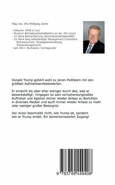 Donald Trump gehört wohl zu jenen Politikern mit den größten Aufmerksamkeitswerten. Er erreicht sie aber eher weniger durch das, was er bewerkstelligt. Hingegen ist sein verhaltensoriginelles Auftreten und Agieren immer wieder Anlass zu Berichten in diversen Medien und auch Anlass zu mehr oder weniger großer Besorgnis.Der Autor beschreibt nicht, wie Trump ist, sondern wie er Trump erlebt. Ein bemerkenswerter Zugang!