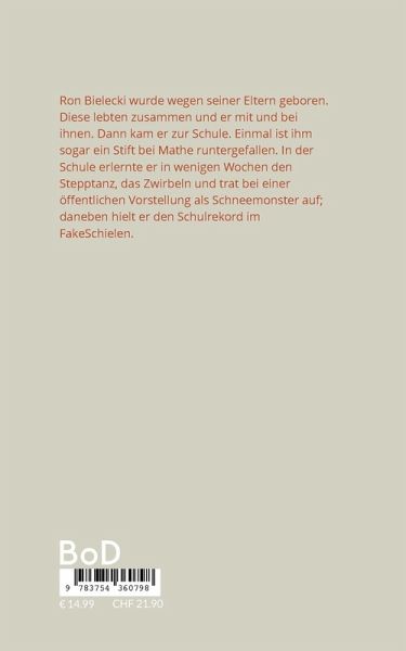 Ron Bielecki wurde wegen seiner Eltern geboren. Diese lebten zusammen und er mit und bei ihnen. Dann kam er zur Schule. Einmal ist ihm sogar ein Stift bei Mathe runtergefallen. In der Schule erlernte er in wenigen Wochen den Stepptanz, das Zwirbeln und trat bei einer öffentlichen Vorstellung als Schneemonster auf; daneben hielt er den Schulrekord im FakeSchielen.