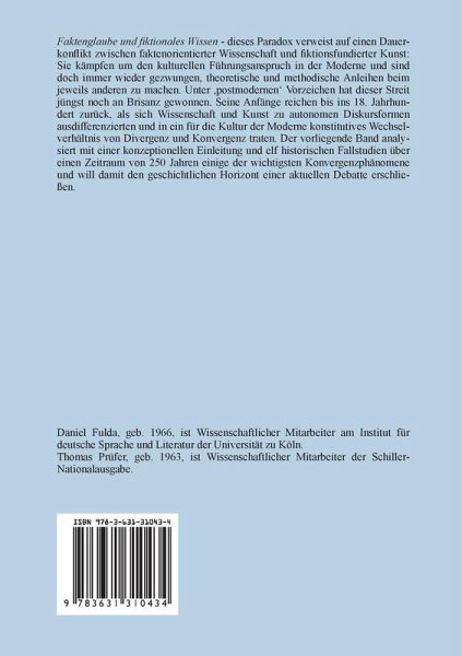 Faktenglaube und fiktionales Wissen - dieses Paradox verweist auf einen Dauerkonflikt zwischen faktenorientierter Wissenschaft und fiktionsfundierter Kunst: Sie kämpfen um den kulturellen Führungsanspruch in der Moderne und sind doch immer wieder gezwungen, theoretische und methodische Anleihen beim jeweils anderen zu machen. Unter "postmodernen" Vorzeichen hat dieser Streit jüngst noch an Brisanz gewonnen. Seine Anfänge reichen bis ins 18. Jahrhundert zurück, als sich Wissenschaft und Kunst zu autonomen Diskursformen ausdifferenzierten und in ein für die Kultur der Moderne konstitutives Wechselverhältnis von Divergenz und Konvergenz traten. Dieser Band analysiert mit einer konzeptionellen Einleitung und elf historischen Fallstudien über einen Zeitraum von 250 Jahren einige der wichtigsten Konvergenzphänomene und will damit den geschichtlichen Horizont einer aktuellen Debatte erschließen.