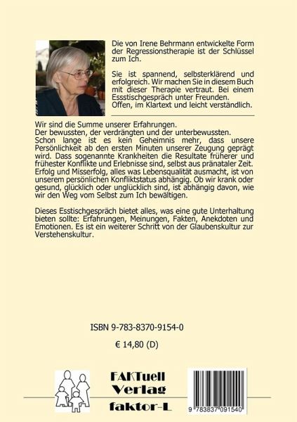 Die von Irene Behrmann entwickelte Formder Regressionstherapie ist der Schlüsselzum Ich.Sie ist spannend, selbsterklärend underfolgreich. Wir machen Sie in diesem Buchmit dieser Therapie vertraut. Bei einemEsstischgespräch unter Freunden.Offen, im Klartext und leicht verständlich.Wir sind die Summe unserer Erfahrungen.Der bewussten, der verdrängten und der unterbewussten.Schon lange ist es kein Geheimnis mehr, dass unserePersönlichkeit ab den ersten Minuten unserer Zeugung geprägtwird. Dass sogenannte Krankheiten die Resultate früherer undfrühester Konflikte und Erlebnisse sind, selbst aus pränataler Zeit.Erfolg und Misserfolg, alles was Lebensqualität ausmacht, ist von unserem persönlichen Konfliktstatus abhängig. Ob wir krank oder gesund, glücklich oder unglücklich sind, ist abhängig davon, wie wir den Weg vom Selbst zum Ich bewältigen.Dieses Esstischgespräch bietet alles, was eine gute Unterhaltung bieten sollte: Erfahrungen, Meinungen, Fakten, Anekdoten und Emotionen. Es ist ein weiterer Schritt von der Glaubenskultur zur Verstehenskultur.