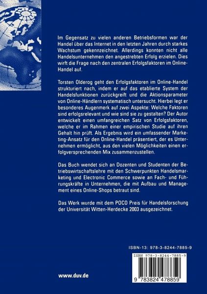 Torsten Olderog geht den Erfolgsfaktoren im Online-Handel strukturiert nach, indem er auf das etablierte System der Handelsfunktionen zurückgreift und die Aktionsparameter von Online-Händlern systematisch untersucht. Hierbei legt er besonderes Augenmerk auf zwei Aspekte: Welche Faktoren sind erfolgsrelevant und wie sind sie zu gestalten? Der Autor entwickelt einen umfangreichen Satz von Erfolgsfaktoren, welche er im Rahmen einer empirischen Studie auf ihren Gehalt hin prüft. Als Ergebnis wird ein umfassender Marketing-Ansatz für den Online-Handel präsentiert, der es Unternehmen ermöglicht, aus den vielen Möglichkeiten einen erfolgversprechenden Mix zusammenzustellen.