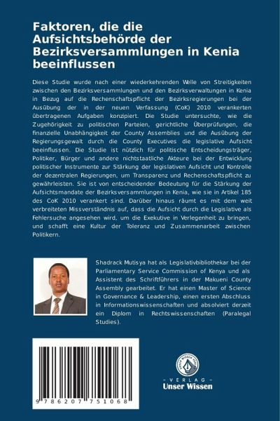 Diese Studie wurde nach einer wiederkehrenden Welle von Streitigkeiten zwischen den Bezirksversammlungen und den Bezirksverwaltungen in Kenia in Bezug auf die Rechenschaftspflicht der Bezirksregierungen bei der Ausübung der in der neuen Verfassung (CoK) 2010 verankerten übertragenen Aufgaben konzipiert. Die Studie untersuchte, wie die Zugehörigkeit zu politischen Parteien, gerichtliche Überprüfungen, die finanzielle Unabhängigkeit der County Assemblies und die Ausübung der Regierungsgewalt durch die County Executives die legislative Aufsicht beeinflussen. Die Studie ist nützlich für politische Entscheidungsträger, Politiker, Bürger und andere nichtstaatliche Akteure bei der Entwicklung politischer Instrumente zur Stärkung der legislativen Aufsicht und Kontrolle der dezentralen Regierungen, um Transparenz und Rechenschaftspflicht zu gewährleisten. Sie ist von entscheidender Bedeutung für die Stärkung der Aufsichtsmandate der Bezirksversammlungen in Kenia, wie sie in Artikel 185 des CoK 2010 verankert sind. Darüber hinaus räumt es mit dem weit verbreiteten Missverständnis auf, dass die Aufsicht durch die Legislative als Fehlersuche angesehen wird, um die Exekutive in Verlegenheit zu bringen, und schafft eine Kultur der Toleranz und Zusammenarbeit zwischen Politikern.