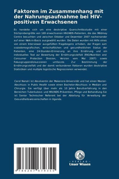 Es handelte sich um eine deskriptive Querschnittsstudie mit einer Stichprobengröße von 169 erwachsenen HIV/AIDS-Patienten, die das Mildmay Centre besuchten und zwischen Oktober und Dezember 2007 nacheinander auf einer Walk-in-Basis ausgewählt wurden. Die Daten wurden mit Hilfe eines von einem Interviewer ausgefüllten Fragebogens erhoben, der Fragen zum soziodemografischen, wirtschaftlichen und gesundheitlichen Status der Patienten, eine 24-Stunden-Erinnerung an ihre Ernährung und ein individuelles Tool zur Bewertung der Ernährungsvielfalt (FAO/Nutrition and Consumer Protection Division, Version vom Mai 2007) sowie Fokusgruppendiskussionen umfasste. Zur Bestimmung der Ernährungsvielfalt und der damit verbundenen Faktoren wurden deskriptive Statistiken und multiple logistische Regressionen verwendet.