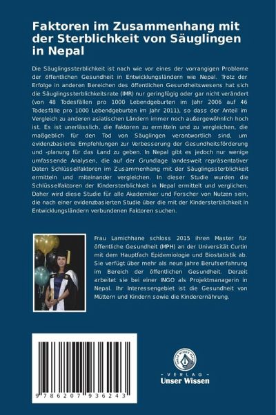 Die Säuglingssterblichkeit ist nach wie vor eines der vorrangigen Probleme der öffentlichen Gesundheit in Entwicklungsländern wie Nepal. Trotz der Erfolge in anderen Bereichen des öffentlichen Gesundheitswesens hat sich die Säuglingssterblichkeitsrate (IMR) nur geringfügig oder gar nicht verändert (von 48 Todesfällen pro 1000 Lebendgeburten im Jahr 2006 auf 46 Todesfälle pro 1000 Lebendgeburten im Jahr 2011), so dass der Anteil im Vergleich zu anderen asiatischen Ländern immer noch außergewöhnlich hoch ist. Es ist unerlässlich, die Faktoren zu ermitteln und zu vergleichen, die maßgeblich für den Tod von Säuglingen verantwortlich sind, um evidenzbasierte Empfehlungen zur Verbesserung der Gesundheitsförderung und -planung für das Land zu geben. In Nepal gibt es jedoch nur wenige umfassende Analysen, die auf der Grundlage landesweit repräsentativer Daten Schlüsselfaktoren im Zusammenhang mit der Säuglingssterblichkeit ermitteln und miteinander vergleichen. In dieser Studie wurden die Schlüsselfaktoren der Kindersterblichkeit in Nepal ermittelt und verglichen. Daher wird diese Studie für alle Akademiker und Forscher von Nutzen sein, die nach einer evidenzbasierten Studie über die mit der Kindersterblichkeit in Entwicklungsländern verbundenen Faktoren suchen.