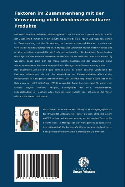 Das Menschenrecht auf Menstruationshygiene ist auch heute noch problematisch, da es in der Gesellschaft immer noch ein Tabuthema darstellt. Viele Frauen und Mädchen stehen im Zusammenhang mit der Verwendung von Menstruationsprodukten vor sozialen und wirtschaftlichen Herausforderungen. In Madagaskar verwenden Frauen unzureichende und prekäre Menstruationsprodukte wie Stoffe aus gebrauchter Kleidung oder Damenbinden, die länger als vier Stunden verwendet werden und die sie manchmal erst nach einem Tag wechseln. Daher stellt sich die Frage, welche Faktoren mit der Verwendung nicht wiederverwendbarer Menstruationsprodukte in Madagaskar in Zusammenhang stehen.Das allgemeine Ziel dieser Studie besteht darin, zu einem besseren Verständnis der Faktoren beizutragen, die mit der Verwendung von Einwegprodukten während der Menstruation in Madagaskar verbunden sind. Zur Durchführung dieser Studie haben wir Daten aus der MICS 6-Umfrage (2018) verwendet. Dabei kommen zwölf Variablen zum Einsatz: Region, Wohnort, Religion, Bildungsgrad der Frau, Medienpräsenz, Lebensstandard im Haushalt, Alter, Familienstand, soziale oder schulische Aktivitäten während der Menstruation usw.