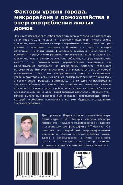 Jeta kniga predstawlqet soboj obzor tschatel'no otobrannoj literatury za 34 goda (s 1981 po 2015 gg.) s cel'ü opredeleniq polnogo spiska faktorow, otwetstwennyh za änergopotreblenie w zhilyh domah na treh urownqh - gorodskom, sosedskom i bytowom - i dalee w chetyreh kategoriqh - äkologicheskoj, fizicheskoj, social'no-äkonomicheskoj i bytowoj. Po rezul'tatam razlichnyh issledowanij bylo wyqwleno 147 faktorow, otwetstwennyh za änergopotreblenie, kotorye perechisleny wmeste s ih polozhitel'nym, otricatel'nym, smeshannym ili otsutstwuüschim znacheniem, za isklücheniem äffekta gorodskogo ostrowa tepla. Vyqwlennaq znachimost' analiziruetsq s uchetom uslowij issledowaniq, takih kak geograficheskaq oblast' issledowaniq, urowen' faktorow, istochnik dannyh, razmer wyborki, metod analiza i änergeticheskie processy. Vyqsnilos', chto ni odno iz issledowanij änergopotrebleniq na urowne domohozqjstw ne uchitywaet wliqnie faktorow na urowne goroda i rajona pri analize änergopotrebleniq i, sledowatel'no, mozhet dat' neäffektiwnye rezul'taty. Poätomu putem otbora wyqwlennyh faktorow byl sostawlen wseob#emlüschij spisok, kotoryj neobhodimo ispol'zowat' wo wseh buduschih issledowaniqh änergopotrebleniq.
