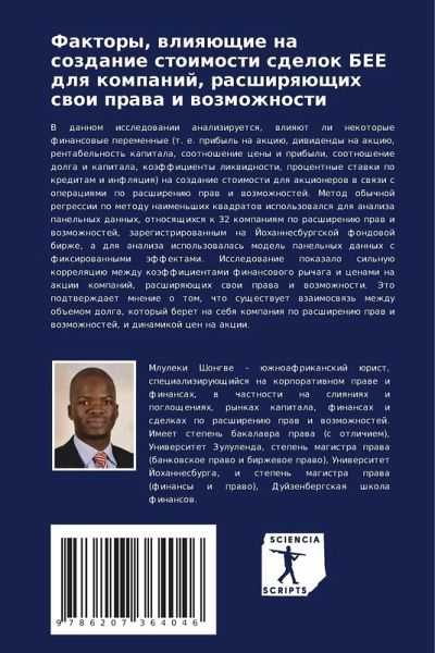 V dannom issledowanii analiziruetsq, wliqüt li nekotorye finansowye peremennye (t. e. pribyl' na akciü, diwidendy na akciü, rentabel'nost' kapitala, sootnoshenie ceny i pribyli, sootnoshenie dolga i kapitala, koäfficienty likwidnosti, procentnye stawki po kreditam i inflqciq) na sozdanie stoimosti dlq akcionerow w swqzi s operaciqmi po rasshireniü praw i wozmozhnostej. Metod obychnoj regressii po metodu naimen'shih kwadratow ispol'zowalsq dlq analiza panel'nyh dannyh, otnosqschihsq k 32 kompaniqm po rasshireniü praw i wozmozhnostej, zaregistrirowannym na Johannesburgskoj fondowoj birzhe, a dlq analiza ispol'zowalas' model' panel'nyh dannyh s fixirowannymi äffektami. Issledowanie pokazalo sil'nuü korrelqciü mezhdu koäfficientami finansowogo rychaga i cenami na akcii kompanij, rasshirqüschih swoi prawa i wozmozhnosti. Jeto podtwerzhdaet mnenie o tom, chto suschestwuet wzaimoswqz' mezhdu ob#emom dolga, kotoryj beret na sebq kompaniq po rasshireniü praw i wozmozhnostej, i dinamikoj cen na akcii.