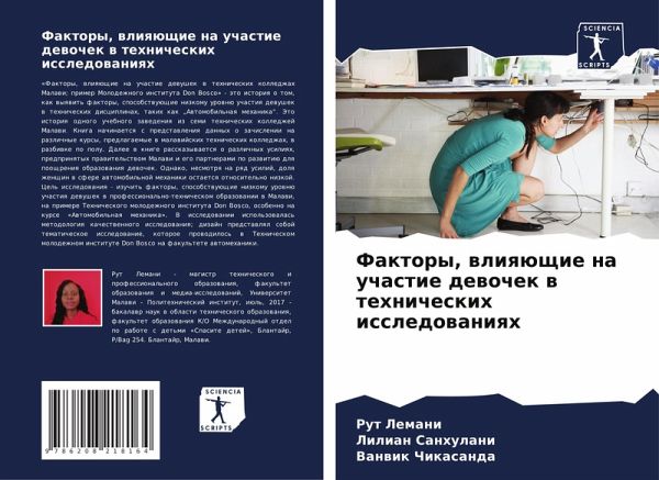 'Faktory, wliqüschie na uchastie dewushek w tehnicheskih kolledzhah Malawi; primer Molodezhnogo instituta Don Bosco' - äto istoriq o tom, kak wyqwit' faktory, sposobstwuüschie nizkomu urownü uchastiq dewushek w tehnicheskih disciplinah, takih kak "Awtomobil'naq mehanika". Jeto istoriq odnogo uchebnogo zawedeniq iz semi tehnicheskih kolledzhej Malawi. Kniga nachinaetsq s predstawleniq dannyh o zachislenii na razlichnye kursy, predlagaemye w malawijskih tehnicheskih kolledzhah, w razbiwke po polu. Dalee w knige rasskazywaetsq o razlichnyh usiliqh, predprinqtyh prawitel'stwom Malawi i ego partnerami po razwitiü dlq pooschreniq obrazowaniq dewochek. Odnako, nesmotrq na rqd usilij, dolq zhenschin w sfere awtomobil'noj mehaniki ostaetsq otnositel'no nizkoj. Cel' issledowaniq - izuchit' faktory, sposobstwuüschie nizkomu urownü uchastiq dewushek w professional'no-tehnicheskom obrazowanii w Malawi, na primere Tehnicheskogo molodezhnogo instituta Don Bosco, osobenno na kurse 'Awtomobil'naq mehanika'. V issledowanii ispol'zowalas' metodologiq kachestwennogo issledowaniq; dizajn predstawlql soboj tematicheskoe issledowanie, kotoroe prowodilos' w Tehnicheskom molodezhnom institute Don Bosco na fakul'tete awtomehaniki.