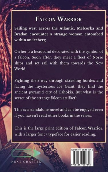 Sailing west across the Atlantic, Melcorka and Bradan encounter a strange woman entombed within an iceberg. On her is a headband decorated with the symbol of a falcon. Soon after, they meet a fleet of Norse ships and set sail with them towards the New World. Fighting their way through skraeling hordes and facing the mysterious Ice Giant, they find the ancient pyramid city of Cahokia. But what is the secret of the strange falcon artifact? This is a standalone novel and can be enjoyed even if you haven't read other books in the series. This is the large print edition of Falcon Warrior, with a larger font / typeface for easier reading.¿