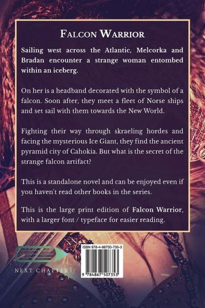 Sailing west across the Atlantic, Melcorka and Bradan encounter a strange woman entombed within an iceberg. On her is a headband decorated with the symbol of a falcon. Soon after, they meet a fleet of Norse ships and set sail with them towards the New World. Fighting their way through skraeling hordes and facing the mysterious Ice Giant, they find the ancient pyramid city of Cahokia. But what is the secret of the strange falcon artifact? This is a standalone novel and can be enjoyed even if you haven't read other books in the series. This is the large print edition of Falcon Warrior, with a larger font / typeface for easier reading.¿
