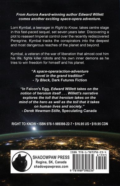 Falcon's Egg, the sequel to Right to Know, is a fast-paced action-adventure. Discovering a plot to reassert Imperial control over the recently rediscovered Peregrine, Lorn Kymbal tracks the conspirators into the deepest and most dangerous reaches of the planet and beyond. Kymbal, a veteran of the war of liberation that almost costs his life, fights killer robots and his own inner demons as he tries to win freedom for himself and his planet.