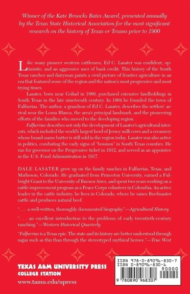 Like many pioneer western cattlemen, Ed C. Lasater was confident, optimistic, and an aggressive user of bank credit. This history of the South Texas rancher and dairyman paints a vivid picture of frontier agriculture in an era that featured some of the region and the nation's most progressive and most trying times. Lasater, born near Goliad in 1860, purchased extensive landholdings in South Texas in the late nineteenth century. In 1904 he founded the town of Falfurrias. The author, a grandson of Ed C. Lasater, describes the settlers' arrival near the Loma Blanca, the area's principal landmark, and the pioneering efforts of the families who moved to the developing region. Falfurrias describes not only the development of Lasater's agricultural interests, which included the world's largest herd of Jersey milk cows and a creamery whose brand-name butter is still sold in the region today. Lasater was also active in politics, combating the early signs of "bossism" in South Texas counties. He ran for governor on the Progressive ticket in 1912, and served as an appointee in the U.S. Food Administration in 1917.