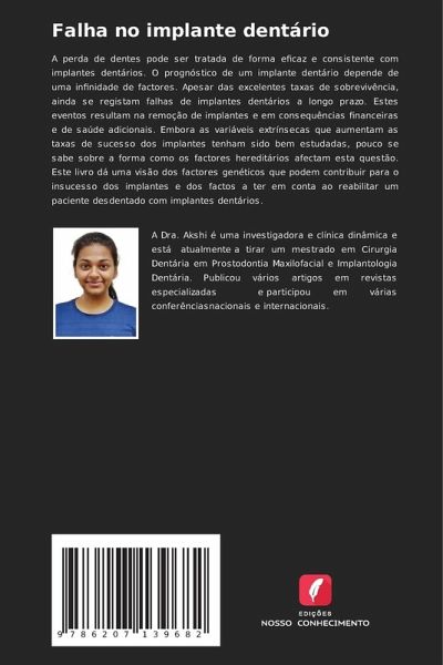 A perda de dentes pode ser tratada de forma eficaz e consistente com implantes dentários. O prognóstico de um implante dentário depende de uma infinidade de factores. Apesar das excelentes taxas de sobrevivência, ainda se registam falhas de implantes dentários a longo prazo. Estes eventos resultam na remoção de implantes e em consequências financeiras e de saúde adicionais. Embora as variáveis extrínsecas que aumentam as taxas de sucesso dos implantes tenham sido bem estudadas, pouco se sabe sobre a forma como os factores hereditários afectam esta questão. Este livro dá uma visão dos factores genéticos que podem contribuir para o insucesso dos implantes e dos factos a ter em conta ao reabilitar um paciente desdentado com implantes dentários.