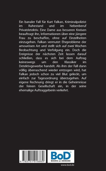 Ein banaler Fall für Kurt Falkan, Kriminalpolizist im Ruhestand und im Nebenberuf Privatdetektiv. Eine Dame aus besseren Kreisen beauftragt ihn, Informationen über eine jüngere Frau zu beschaffen, ohne auf Einzelheiten einzugehen. Falkan vermutet Eheprobleme der amourösen Art und stellt sich auf zwei Wochen Beobachtung und Verfolgung ein. Doch die Ereignisse der nächsten Zeit lassen darauf schließen, dass es sich bei dem Auftrag keineswegs um den Klassiker im Detektivgewerbe handelt. Als ihm der Fall dann völlig überraschend wieder entzogen wird, hat Falkan jedoch schon zu viel Blut geleckt, um einfach zur Tagesordnung überzugehen. Auf eigene Rechnung dringt er in die Geheimnisse der feinen Gesellschaft ein, in der seine ehemalige Auftraggeberin verkehrt.