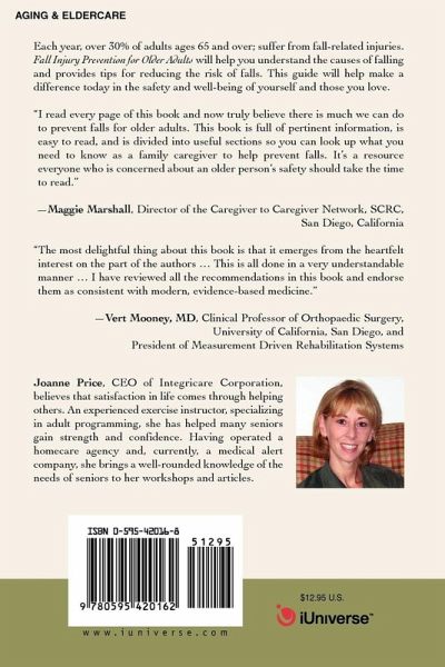 Each year, over 30% of adults ages 65 and over; suffer from fall-related injuries. Fall Injury Prevention for Older Adults will help you understand the causes of falling and provides tips for reducing the risk of falls. This guide will help make a difference today in the safety and well-being of yourself and those you love. "I read every page of this book and now truly believe there is much we can do to prevent falls for older adults. This book is full of pertinent information, is easy to read, and is divided into useful sections so you can look up what you need to know as a family caregiver to help prevent falls. It's a resource everyone who is concerned about an older person's safety should take the time to read." -Maggie Marshall, Director of the Caregiver to Caregiver Network, SCRC, San Diego, California "The most delightful thing about this book is that it emerges from the heartfelt interest on the part of the authors . This is all done in a very understandable manner . I have reviewed all the recommendations in this book and endorse them as consistent with modern, evidence-based medicine." -Vert Mooney, MD, Clinical Professor of Orthopaedic Surgery, University of California, San Diego, and President of Measurement Driven Rehabilitation Systems