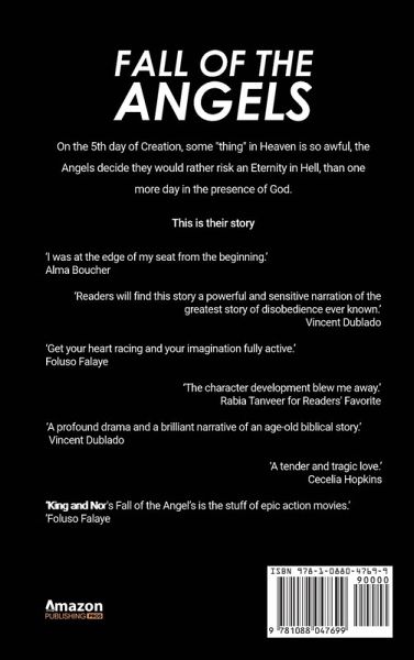 On the 5th day of Creation, some "thing" in Heaven is so awful,the Angels decide they would rather risk an Eternity in Hell,than one more day in the presence of God.This is their story. " I was at the edge of my seat from the beginning." Alma Boucher "Readers will find this story a powerful and sensitive narration of the greatest story of disobedience ever known." Vincent Dublado "Get your heart racing and your imagination fully active." Foluso Falaye "The character development blew me away." Rabia Tanveer for Readers' Favorite 'A profound drama and a brilliant narrative of an age-old biblical story.' Vincent Dublado 'A tender and tragic love.' Cecelia Hopkins ¿'King and Nor's Fall of the Angel's is the stuff of epic action movies.' ' Foluso Falaye