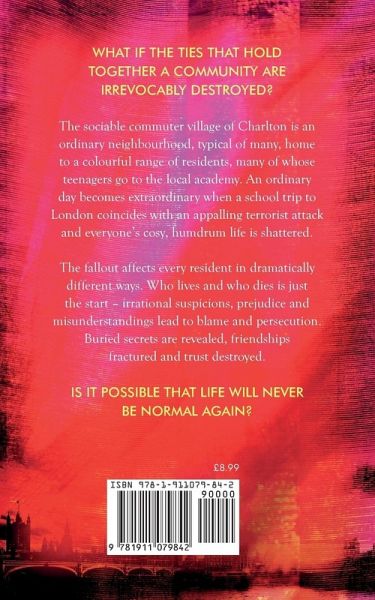 WHAT IF THE TIES THAT HOLD TOGETHER A COMMUNITY ARE IRREVOCABLY DESTROYED? The sociable commuter village of Charlton is an ordinary neighbourhood, typical of many, home to a colourful range of residents, many of whose teenagers go to the local academy. An ordinary day becomes extraordinary when a school trip to London coincides with an appalling terrorist attack and everyone’s cosy, humdrum life is shattered. The fallout affects every resident in dramatically different ways. Who lives and who dies is just the start – irrational suspicions, prejudice and misunderstandings lead to blame and persecution. Buried secrets are revealed, friendships fractured and trust destroyed. IS IT POSSIBLE THAT LIFE WILL NEVER BE NORMAL AGAIN?