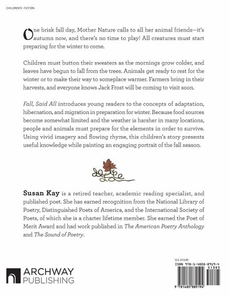 One brisk fall day, Mother Nature calls to all her animal friends-it's autumn now, and there's no time to play! All creatures must start preparing for the winter to come. Children must button their sweaters as the mornings grow colder, and leaves have begun to fall from the trees. Animals get ready to rest for the winter or to make their way to someplace warmer. Farmers bring in their harvests, and everyone knows Jack Frost will be coming to visit soon. Fall, Said All introduces young readers to the concepts of adaptation, hibernation, and migration in preparation for winter. Because food sources become somewhat limited and the weather is harsher in many locations, people and animals must prepare for the elements in order to survive. Using vivid imagery and flowing rhyme, this children's story presents useful knowledge while painting an engaging portrait of the fall season.