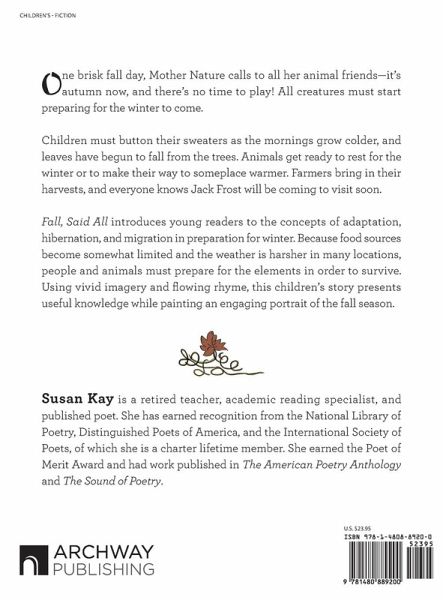 One brisk fall day, Mother Nature calls to all her animal friends-it's autumn now, and there's no time to play! All creatures must start preparing for the winter to come. Children must button their sweaters as the mornings grow colder, and leaves have begun to fall from the trees. Animals get ready to rest for the winter or to make their way to someplace warmer. Farmers bring in their harvests, and everyone knows Jack Frost will be coming to visit soon. Fall, Said All introduces young readers to the concepts of adaptation, hibernation, and migration in preparation for winter. Because food sources become somewhat limited and the weather is harsher in many locations, people and animals must prepare for the elements in order to survive. Using vivid imagery and flowing rhyme, this children's story presents useful knowledge while painting an engaging portrait of the fall season.