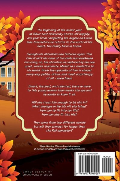 The beginning of his senior year at Silver Leaf University starts off happily; one year from completing his degree and even less time before he returns to the world of his heart, the family farm in Korea. Seonghun's attention has faltered again. This time it isn't his case of incurable homesickness returning; no, his attention is captured by his new quiet, elusive roommate. Maliah is a revelation to his world. She's the opposite of him in almost every way; petite, driven, and most surprisingly of all - she's black. Smart, focused, and talented, there is more to this young woman than meets the eye and he wants to know it all. Will she trust him enough to let him in? What changes in his life will she bring? How can he fit into her life? How can she fit into his? They come from two different worlds but will they connect for longer than the Fall semester?