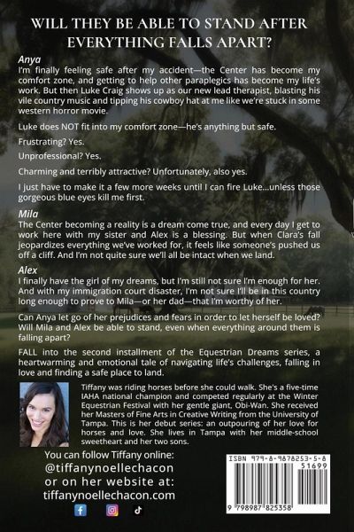 Will they be able to stand after everything falls apart? Anya I'm finally feeling safe after my accident-the Center has become my comfort zone, and getting to help other paraplegics has become my life's work. But then Luke Craig shows up as our new lead therapist, blasting his vile country music and tipping his cowboy hat at me like we're stuck in some western horror movie. Luke does NOT fit into my comfort zone-he's anything but safe. Frustrating? Yes. Unprofessional? Yes. Charming and terribly attractive? Unfortunately, also yes. I just have to make it a few more weeks until I can fire Luke...unless those gorgeous blue eyes kill me first. Mila The Center becoming a reality is a dream come true, and every day I get to work here with my sister and Alex is a blessing. But when Clara's fall jeopardizes everything we've worked for, it feels like someone's pushed us off a cliff. And I'm not quite sure we'll all be intact when we land. Alex I finally have the girl of my dreams, but I'm still not sure I'm enough for her. And with my immigration court disaster, I'm not sure I'll be in this country long enough to prove to Mila-or her dad-that I'm worthy of her. Can Anya let go of her prejudices and fears in order to let herself be loved? Will Mila and Alex be able to stand, even when everything around them is falling apart? FALL into the second installment of the Equestrian Dreams series, a heartwarming and emotional tale of navigating life's challenges, falling in love and finding a safe place to land. Follow Anya, Mila and Alex on a journey where hopes are dashed, enemies become something more than you'd ever imagine, and lives are rebuilt after they fall. This is the second book in the Equestrian Dreams series, which is a clean romance series set in Florida. You'll find all the sizzling chemistry you love without any smut. Equestrian Dreams: A Florida Sweet Romance Series: Off Course (#0.5) JUMP (#1) FALL (#2) SOAR (#3)