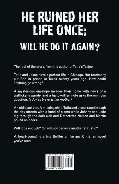 Tatia and Jesse have a perfect life in Chicago. Her testimony put Eric in prison in Texas twenty years ago. How could anything go wrong? A mysterious envelope invades their home with news of a trafficker’s parole, and a handwritten note asks the ominous question about their daughter: Is Joy as brave as her mother? An old black van. A missing child. Tatia and Jesse race through the city streets with a band of bikers while Johnny and Jade dig through the dark web and Detectives Nelson and Martin pound on doors. Will it be enough? Or will Joy become another statistic?