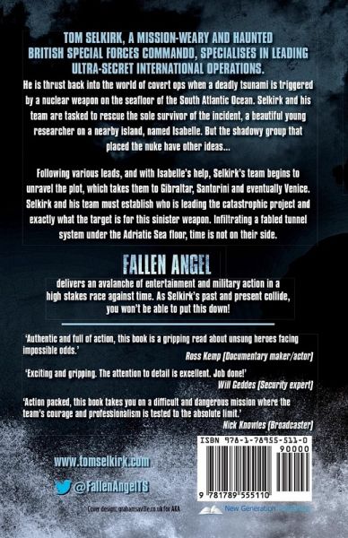 Tom Selkirk, a mission-weary and haunted British Special Forces Commando, specialises in leading ultra-secret international operations. He is thrust back into the world of covert ops when a deadly tsunami is triggered by a nuclear weapon on the seafloor of the South Atlantic Ocean. Selkirk and his team are tasked to rescue the sole survivor of the incident, a beautiful young researcher on a nearby island, named Isabelle. But the shadowy group that placed the nuke have other ideas... Following various leads, and with Isabelle's help, Selkirk's team begins to unravel the plot, which takes them to Gibraltar, Santorini and eventually venice. Selkirk and his team must establish who is leading the catastrophic project and exactly what the target is for this sinister weapon. Infiltrating a fabled tunnel system under the Adriatic Sea floor, time is not on their side. Fallen Angel delivers an avalanche of entertainment and military action in a high stakes race against time. As Selkirk's past and present collide, you won't be able to put this down!