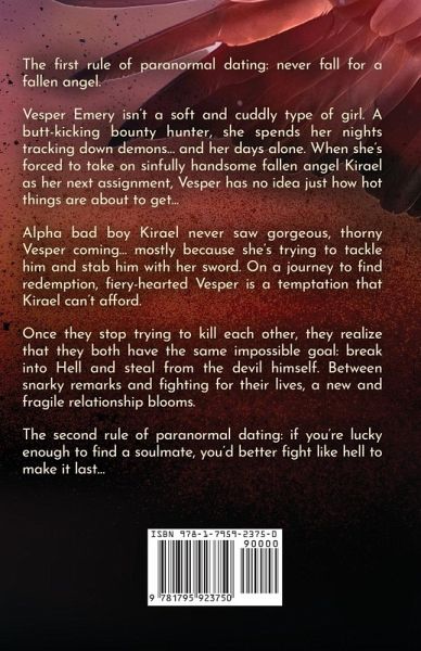 The first rule of paranormal dating: never fall for a fallen angel. Vesper Emery isn't a soft and cuddly type of girl. A butt-kicking bounty hunter, she spends her nights tracking down demons... and her days alone. When she's forced to take on sinfully handsome fallen angel Kirael as her next assignment, Vesper has no idea just how hot things are about to get... Alpha bad boy Kirael never saw gorgeous, thorny Vesper coming... mostly because she's trying to tackle him and stab him with her sword. On a journey to find redemption, fiery-hearted Vesper is a temptation that Kirael can't afford. Once they stop trying to kill each other, they realize that they both have the same impossible goal: break into Hell and steal from the devil himself. Between snarky remarks and fighting for their lives, a new and fragile relationship blooms. The second rule of paranormal dating: if you're lucky enough to find a soulmate, you'd better fight like hell to make it last...