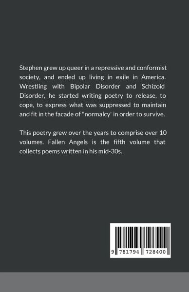 Stephen grew up queer in a repressive and conformist society, and ended up living in exile in America. Wrestling with Bipolar Disorder and Schizoid Disorder, he started writing poetry to release, to cope, to express what was suppressed to maintain and fit in the facade of "normalcy' in order to survive. This poetry grew over the years to comprise over 10 volumes. Fallen Angels is the fifth volume that collects poems written in his mid-30s.