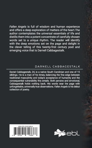 Fallen Angels is full of wisdom and human experience and offers a deep exploration of matters of the heart. The author contemplates the universal essentials of life and distills them into a potent concentrate of carefully chosen words set to a unique rhythm. The reader will identify with the deep emotions set on the page and delight in the clever telling of this twenty-first century poet and emerging voice that is Darnell Cabbagestalk.