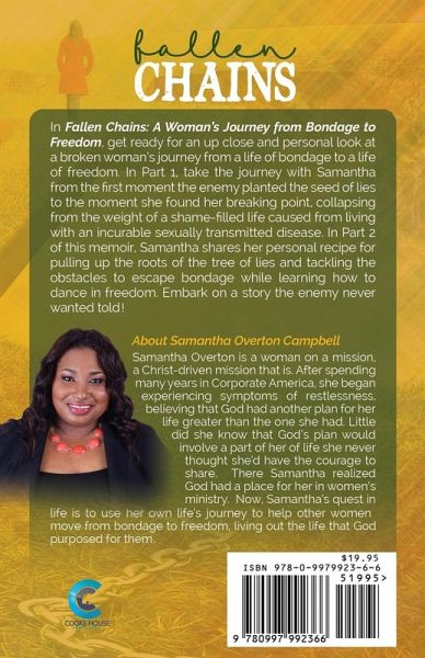 In Fallen Chains: A Woman’s Journey from Bondage to Freedom, get ready for an up close and personal look at a broken woman’s journey from a life of bondage to a life of freedom. In Part 1, take the journey with Samantha from the first moment the enemy planted the seed of lies to the moment she found her breaking point, collapsing from the weight of a shame-filled life caused from living with an incurable sexually transmitted disease. In Part 2 of this memoir, Samantha shares her personal recipe for pulling up the roots of the tree of lies and tackling the obstacles to escape bondage while learning how to dance in freedom. Embark on a story the enemy never wanted told!