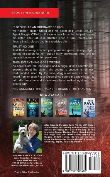 An early October snowstorm isn't the only thing that blindsides K9 handler Ryder Creed and his scent dog, Grace. SUDDENLY THE TRACKERS BECOME THE TRAPPED. "Kava melds fact and fiction into a fast-moving, compelling and totally believable story." -Crime Review, UK IT BEGAN AS AN ORDINARY SEARCH. K9 handler, Ryder Creed and his scent dog, Grace return to Nebraska to join FBI Agent, Maggie O'Dell on the same task force that helped rescue his sister, Brodie a year ago. But their job is interrupted when a rural Postal carrier finds a black, plastic bag discarded in a grassy roadside ditch. What's inside is shocking to even these seasoned investigators. TRUST NO ONE. Just that morning another young woman has gone missing. Is her disappearance connected? Did she run away? Or was she taken? And is it only a matter of time before she ends up in a roadside ditch? Ryder agrees to search for her, but an early snowstorm threatens to replace the warm fall temperatures. His scent dog, Grace has never worked in cold and snowy conditions. THEN EVERYTHING GOES WRONG. The snow blurs the landscape and grinds life to a halt. As Maggie O'Dell searches for answers about the victim, she begins to uncover a cold-blooded, ruthless killer who has murdered before. By the time Maggie realizes no one has heard or seen Ryder since before the snow began to fall, she fears he and Grace may have walked into the killer's path. Reading Alex Kava for the first time? If you enjoy action and adventure, suspense thrillers from the following authors, you'll enjoy Alex. For fans of: CJ Box, Paul Dorion, James Rollins, Lisa Gardner, Gregg Hurwitz, Iris Johansen, Tess Gerritsen, David Baldacci, Margaret Mizushima, Lee Child, David Rosenfelt. New York Times, USA Today and Amazon bestselling author, Alex Kava, is the recipient of two Nebraska Book Awards, a Florida Book Award and the Mari Sandoz Award.