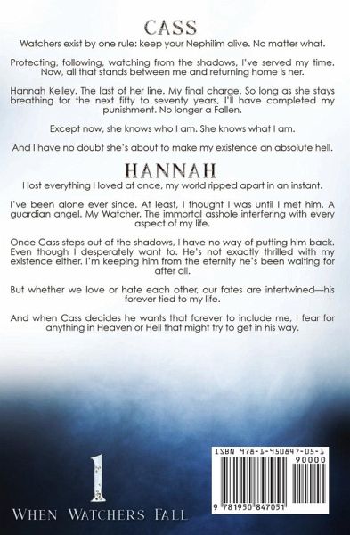 Cass Watchers exist by one rule: keep your Nephilim alive. No matter what. Protecting, following, watching from the shadows, I've served my time. Now, all that stands between me and returning home is her. Hannah Kelley. The last of her line. My final charge. So long as she stays breathing for the next fifty to seventy years, I'll have completed my punishment. No longer a Fallen. Except now, she knows who I am. She knows what I am. And I have no doubt she's about to make my existence an absolute hell. Hannah I lost everything I loved at once, my world ripped apart in an instant. I've been alone ever since. At least, I thought I was until I met him. A guardian angel. My Watcher. The immortal asshole interfering with every aspect of my life. Once Cass steps out of the shadows, I have no way of putting him back. Even though I desperately want to. He's not exactly thrilled with my existence either. I'm keeping him from the eternity he's been waiting for after all. But whether we love or hate each other, our fates are intertwined-his forever tied to my life. And when Cass decides he wants that forever to include me, I fear for anything in Heaven or Hell that might try to get in his way. Fallen Rebel can be read as a complete standalone and is the first book in the When Watchers Fall series.